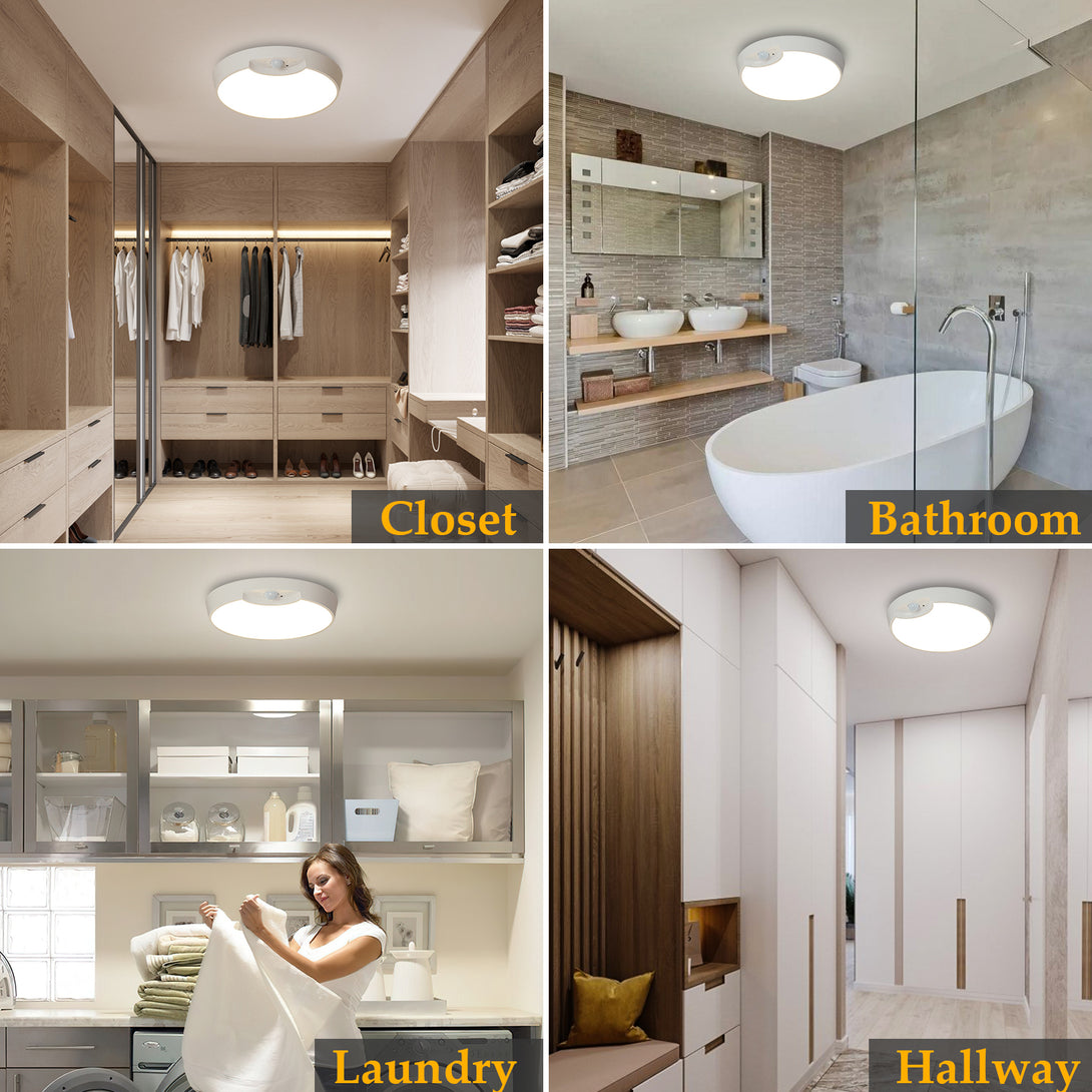 - 【Wireless Installation & Wide Applications】: No hard wiring requirement, you can install the wireless LED ceiling light anywhere! Perfect for dark areas without wired power such as closet, shower, stairs, pantry, shed, hallway, porch, garage, etc (Size 7.5"D x 2"H)