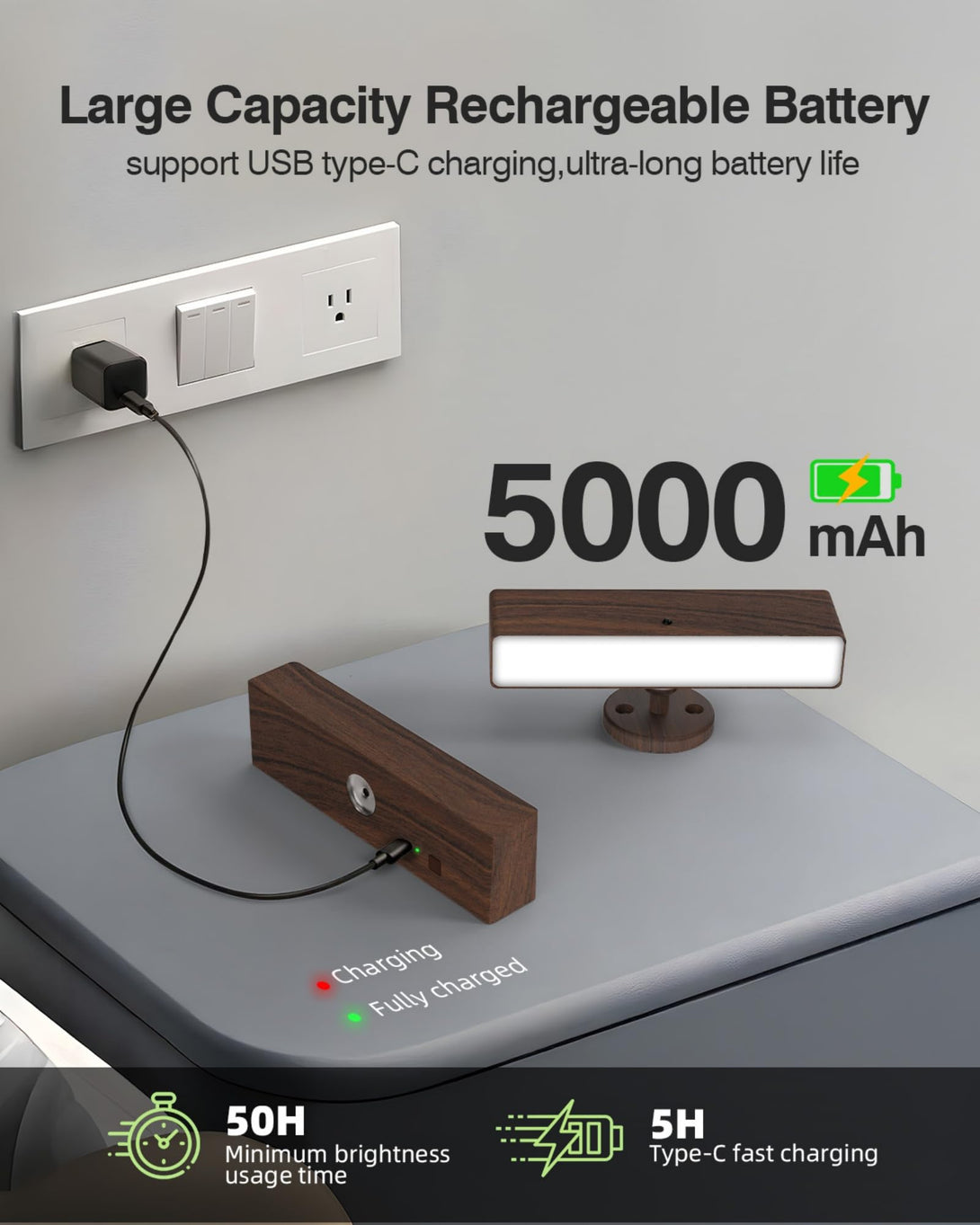 • 🔋 Rechargeable Battery Powered Wall Sconce: Our LED wall mounted lamps have built-in 5000mAh rechargeable battery. After fully charged, the wall sconce set of two can provide up to 50 hours of light at minimum brightness, or up to 10 hours at maximum brightness. Portable cordless wall sconce light with USB-C charging port