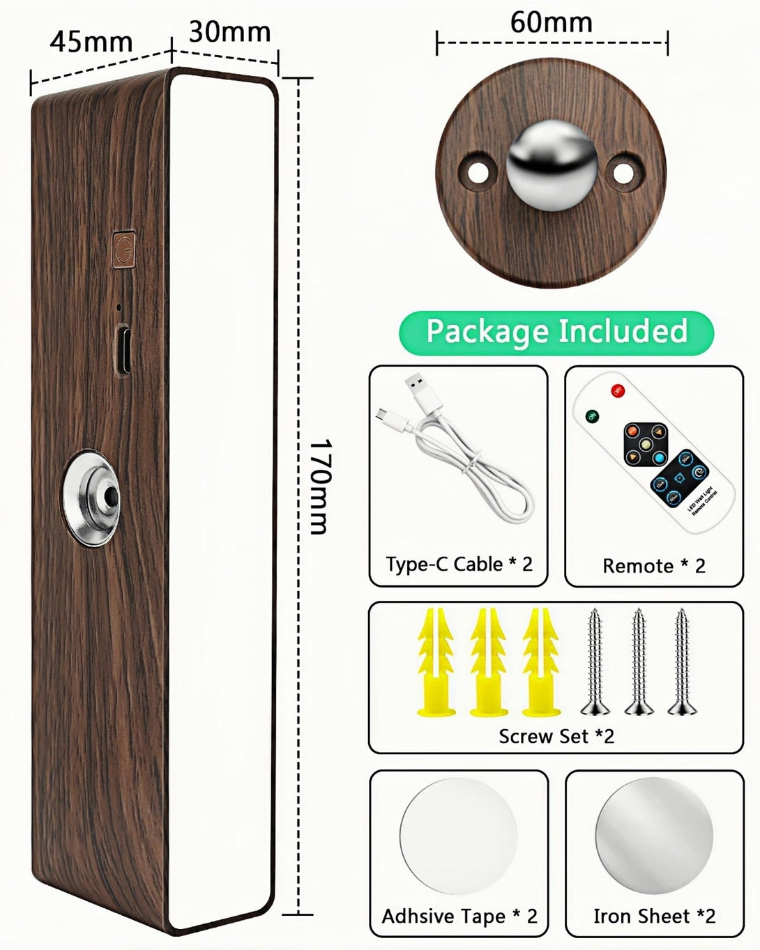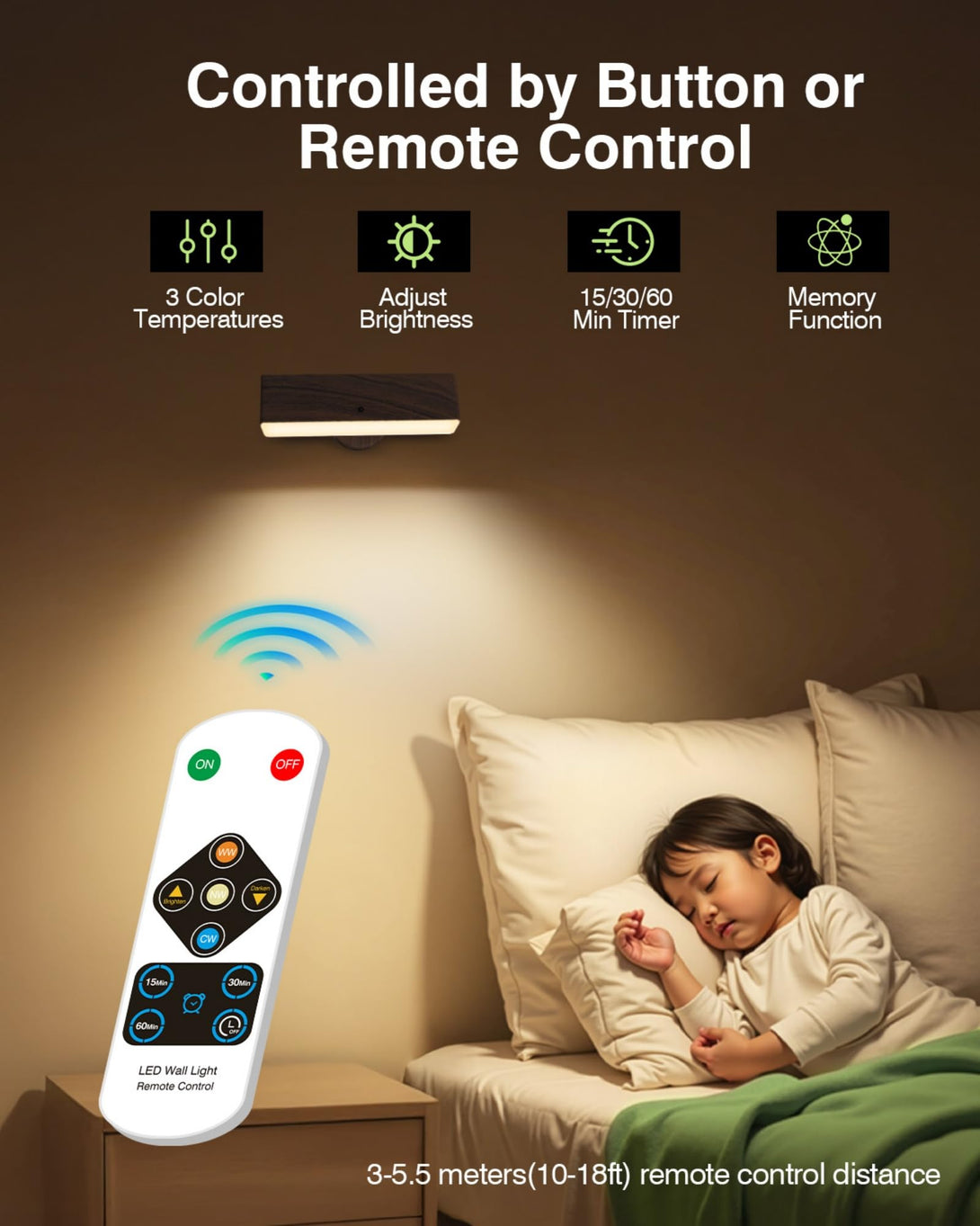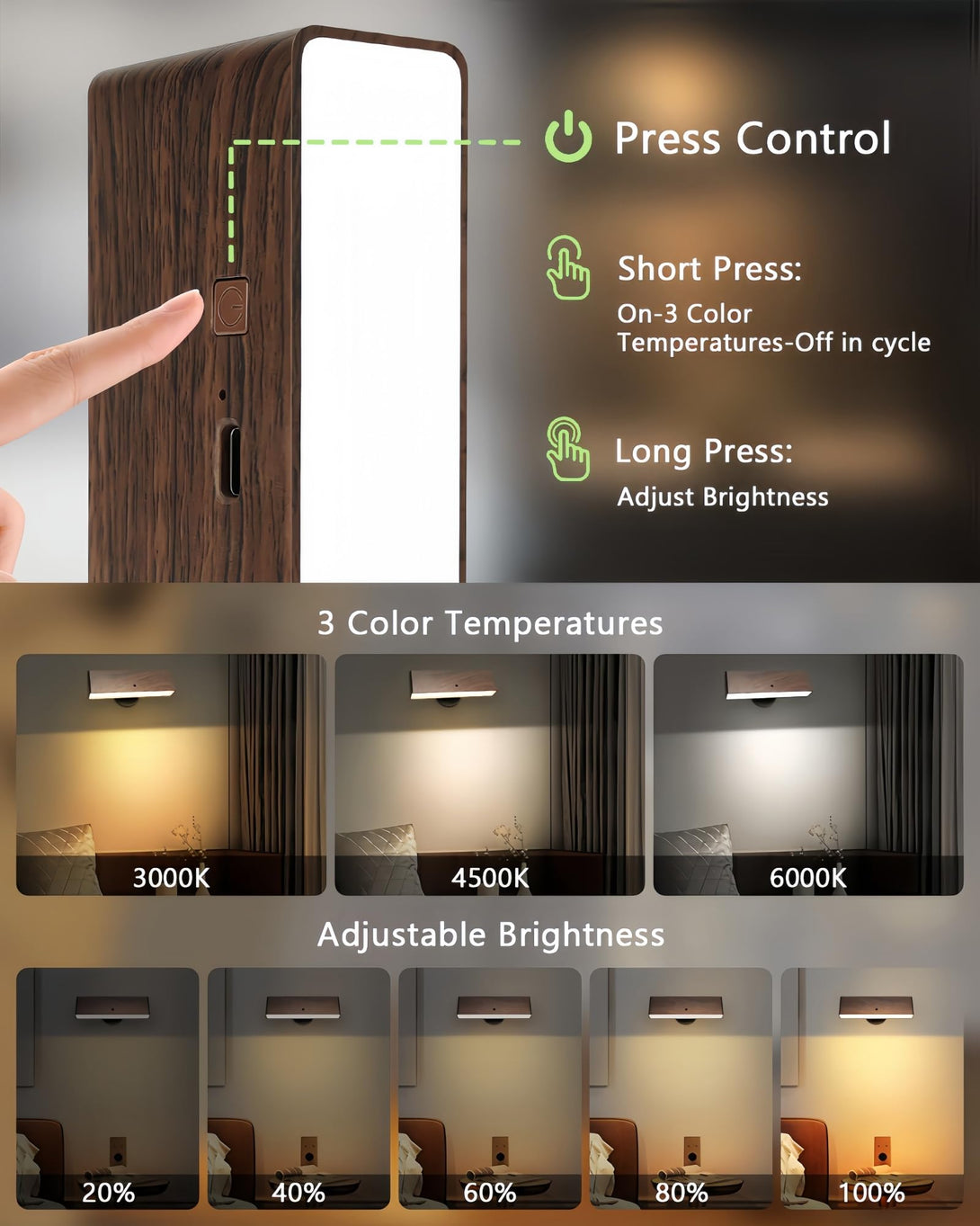 • 📱 Dual Control & Timing Function: Our rechargeable wall lights feature two control options: button and remote. Use the button to adjust color temperatures(3000K/4500K/6000K) and brightness(20%-100%) effortlessly, or switch to the remote for advanced functions like timing(15/30/60min auto-off), perfect for bedtime reading or kids' night light