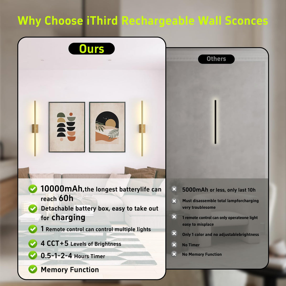 ✔️【High-Capacity Rechargeable Wall Sconce】The LED wall sconce features a 10000mAh detachable battery, which offers up to 20 hours of continuous lighting at maximum brightness, and 60 hours on the lowest setting for ambient lighting. The wireless wall sconce set of 2 not only provides reliable lighting but also serves as elegant wall decor, instantly adding warmth and romance to any room in your home