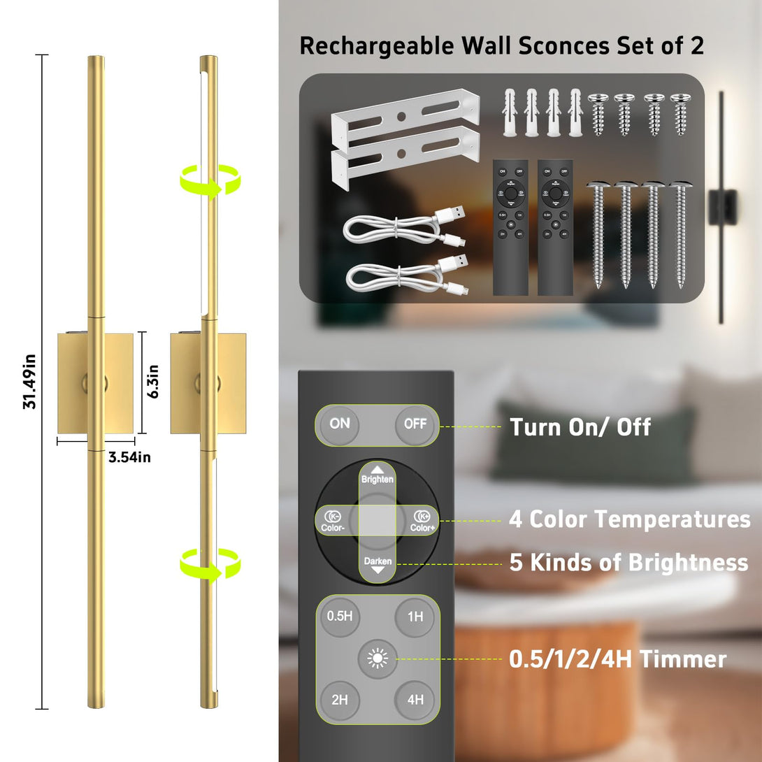Toowell Battery Operated Wall Sconces Set of Two, Dimmable Wireless Wall Lights with Remote, 31-inch LED Rechargeable Sconces, 360° Lighting Wall Scone Decor for TV, Mirror, Bedroom, Living Room(Gold)